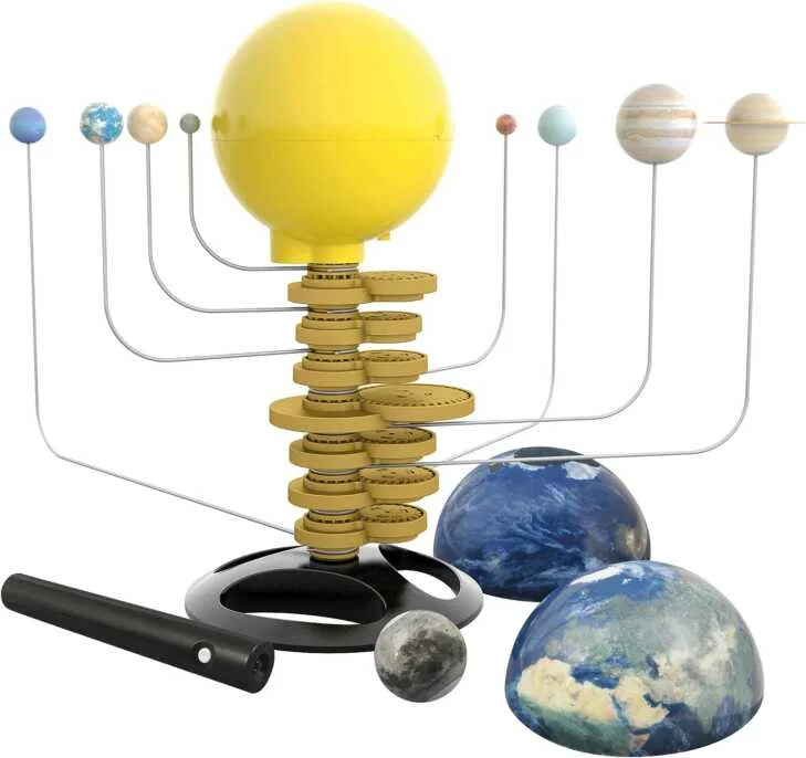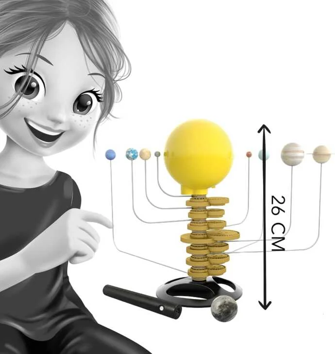 Découvre le système solaire et ses 8 planètes qui tournent en respectant les cycles de révolution sur une durée de 35 minutes. Le Soleil au centre s’éclaire comme une veilleuse. Transforme ton modèle en plaçant la Terre et la Lune et reproduis les éclipses avec la lampe incuse.