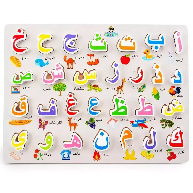Mots-clés : Puzzle, alphabet arabe, bois, apprentissage, enfant, jouet, lettres, mots, éducatif, ludique, couleurs, motricité, images.